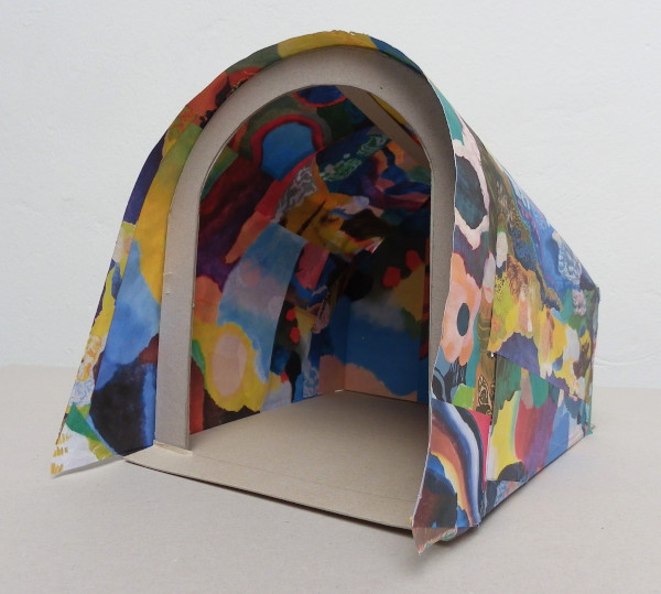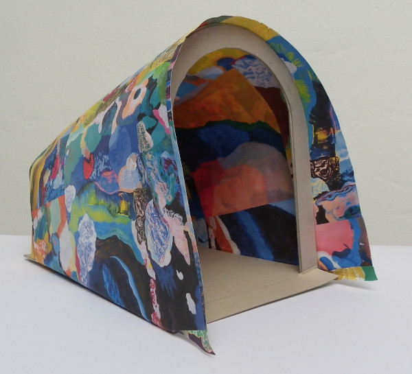 Modell „SMOOTH HABITAT“, 2023, Maßstab 1:10, H: 25 cm, B: 21 cm, T: 30 cm, Collage mit Ausdrucken auf Papier nach Bildern aus der Serie “Höhlen” auf Pappgerüst. Rückansicht