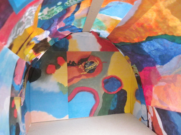 Papiermodell im Maßstab 1:10 für eine begehbare Höhle aus selbst genähten und bestickten Stoffdecken, die Bilder von Felswänden (siehe Höhlen 2022), die ich in den letzten Jahren gemalt habe, imitieren.